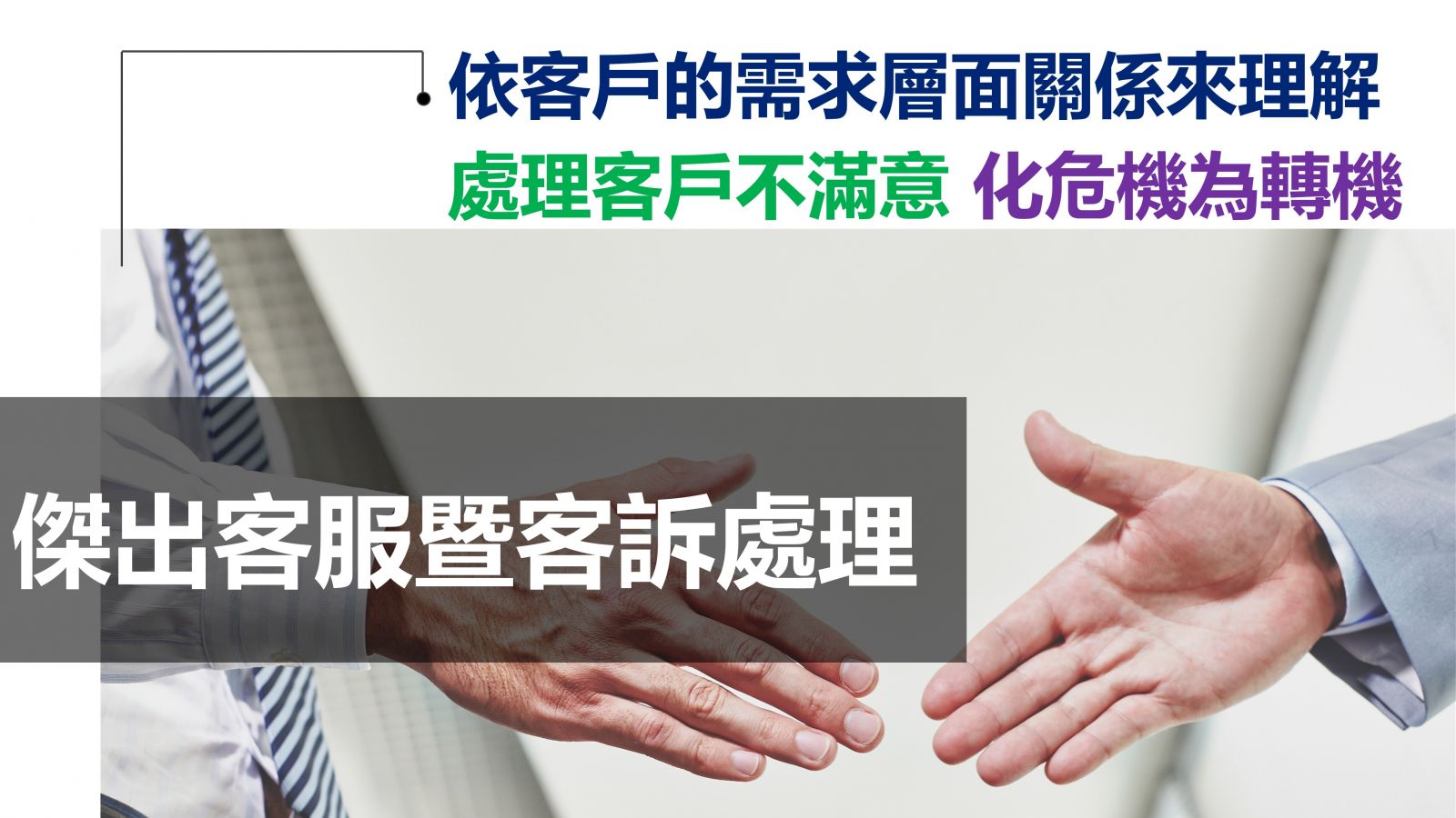 了解負面的客戶關係造成的原因,並從雙方共同的利益立場,建立客戶的原則與技巧,有效管理你與客戶雙方的服務程序與情緒創造雙贏,並以有效率的行讓客戶消除顧慮,提升客戶滿度及忠誠度。