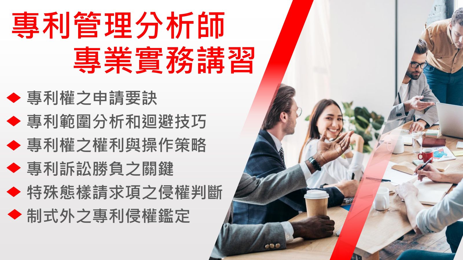 本課程提供完整及專業之專利實務教學,課程涵括專利管理分析之重要領域,透過實務案例,提供相關基本概念、技術及侵權實務…等專業技術。