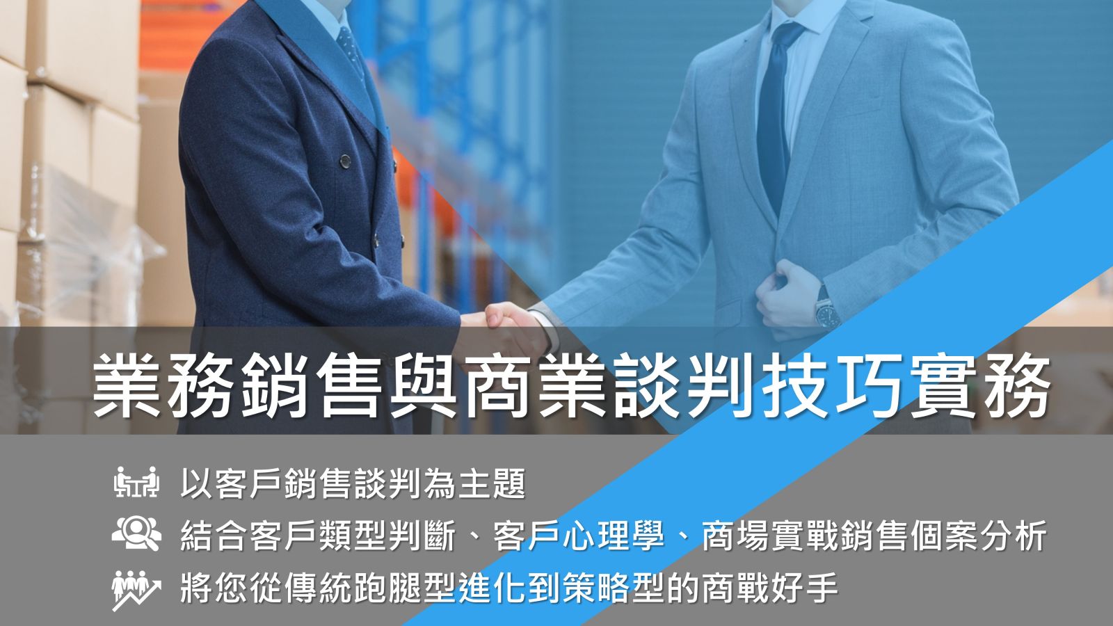 - 本課程以客戶銷售談判為主題,結合客戶類型判斷、客戶心理學、商場實戰銷售個案分析,將您從傳統跑腿型,一次進化到策略型的商戰好手。
