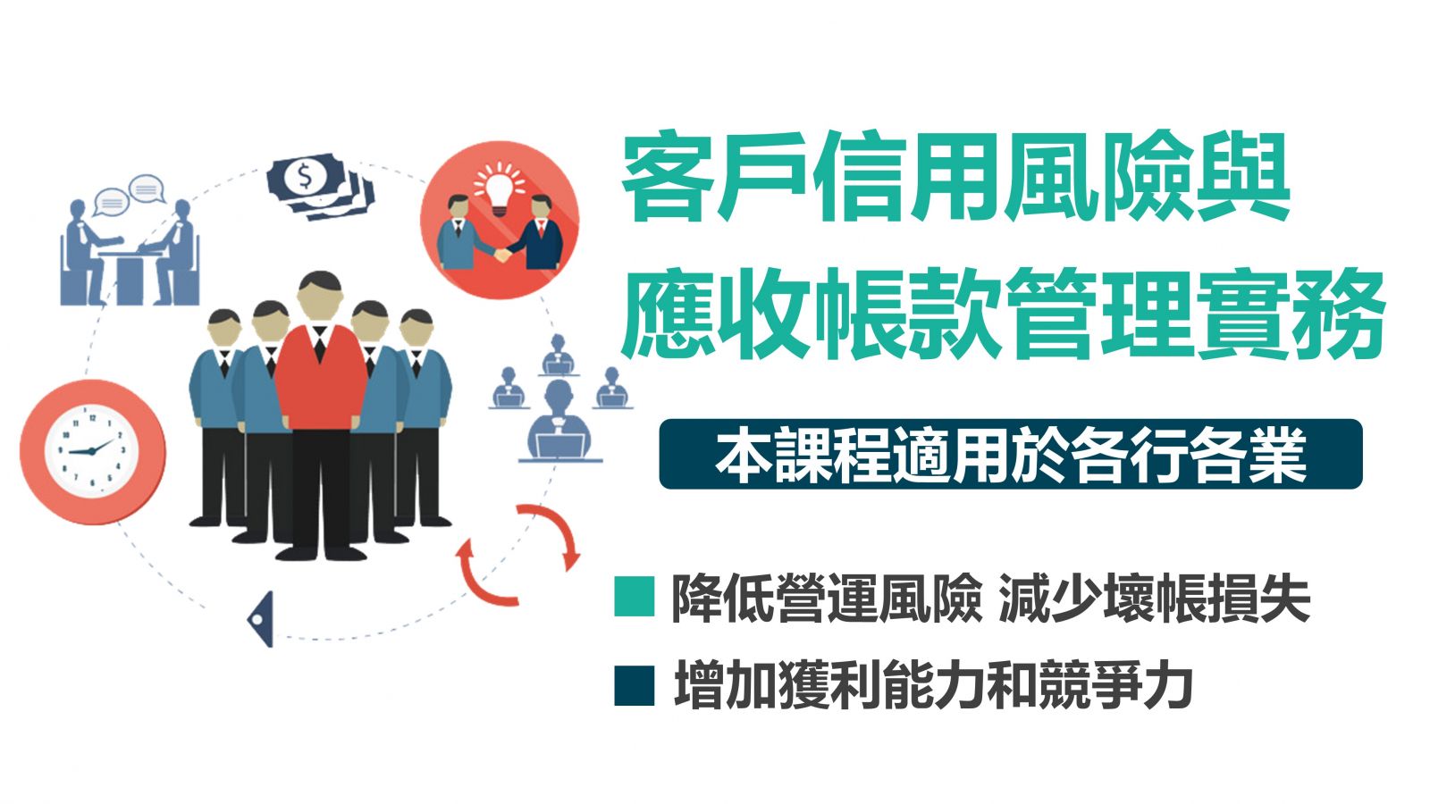 本課程適用於各行各業,是當前企業老闆與員工的必備管理知能,也是企業將財務風險管理落實至日常營運管理的第一步,可讓您一次養成客戶風險管理與應收帳款控管及分析能力。課程之設計包含了客戶信用風險管控之事前、事中、與事後之管理。其目的在防範控制、降低應收帳款給企業帶來之營運風險,減少企業的壞帳損失,以增加企業的獲利能力和競爭力。