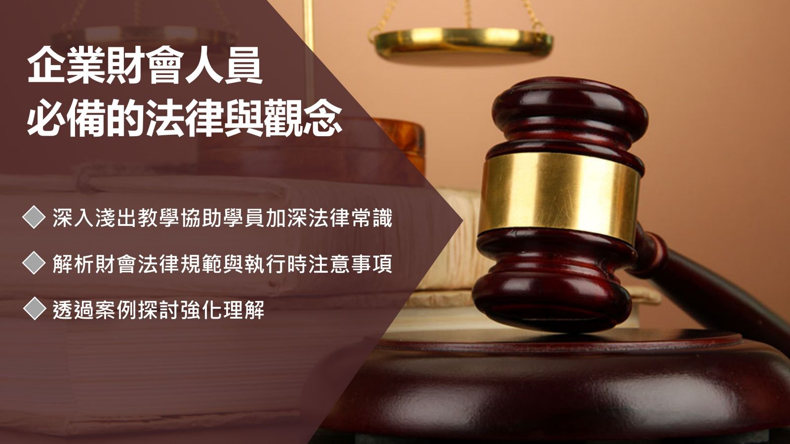 課程目標:以深入淺出的方式,協助學員更加深相關法律常識之觀念、並使其對財會專業法律之規範與其執行時應注意事項,透過案例探討更易理解。