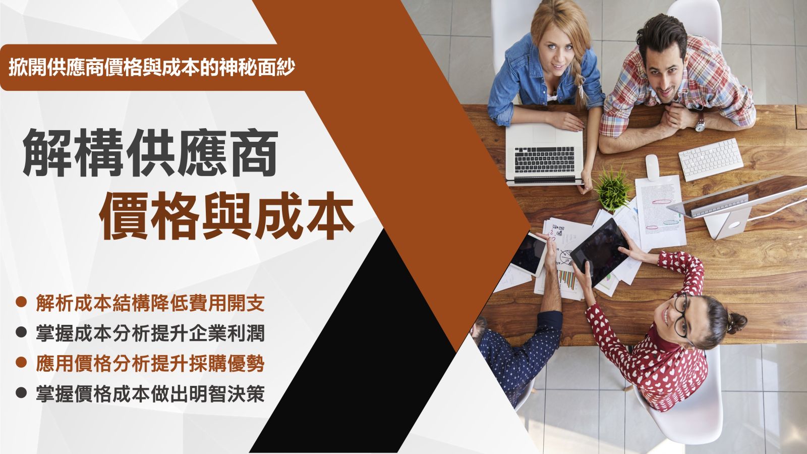 本課程以系統化架構介紹價格與成本分析,搭配國際最新實務案例解析,讓學員快速掌握核心技巧,課後即可立即應用於工作,創造實質效益。