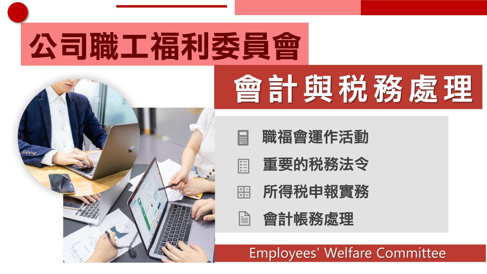 ◆目的:有關職工福利委員會之會計帳務處理及申報所得稅相關事項繁瑣,為協助經手處理人,能有效協助職工福利委員會及公司會計帳務處理,符合法令規定、做好相關企業租稅規劃,。課程中也將提點實務上須注意之問題解析,避免不必要行政作業疏失。