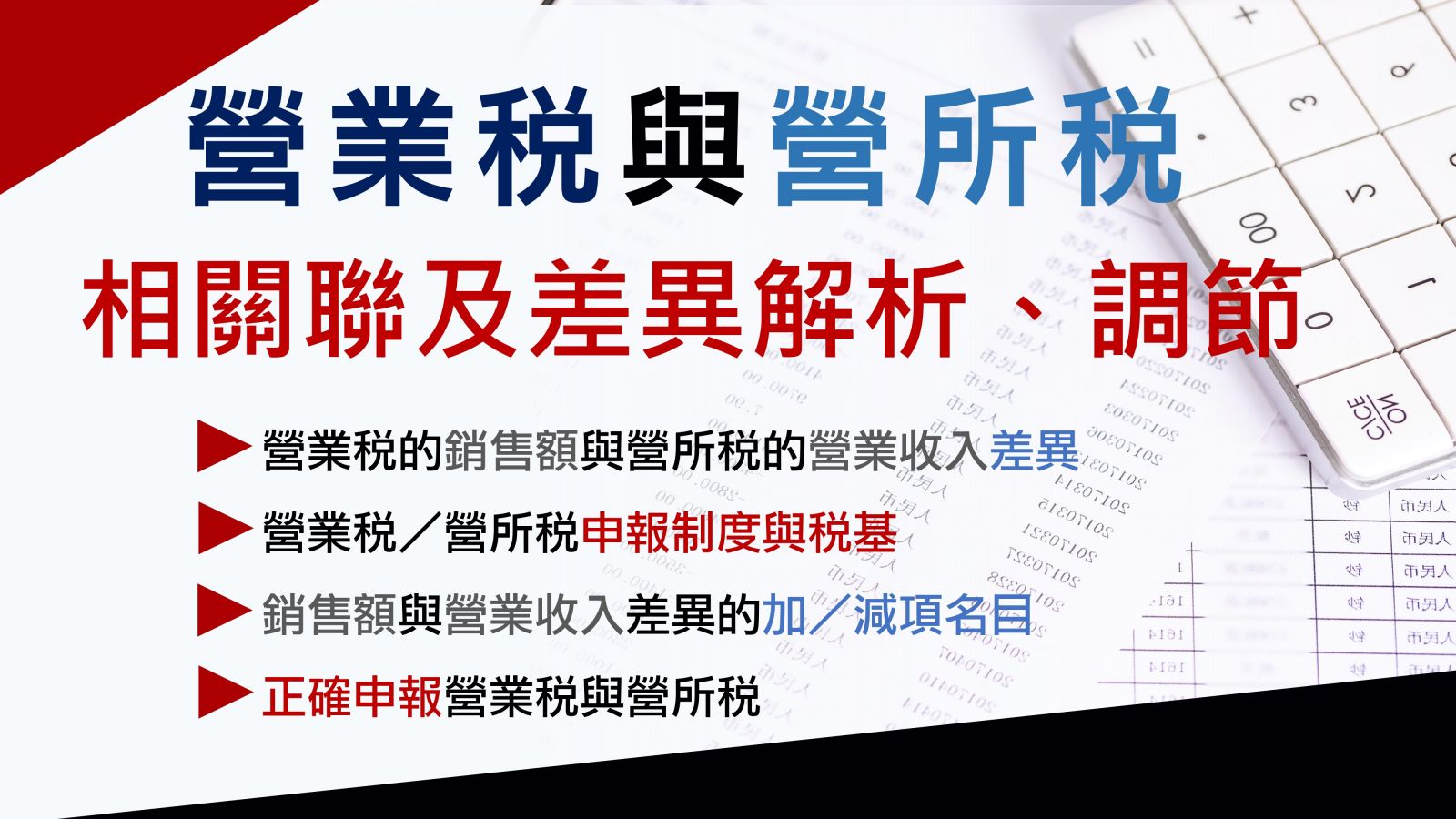 營業稅實屬消費稅性質,營業人僅為居間代收代付的功能;但營所稅實屬企業所得,依據稅法計算課稅的稅基後,再針對所得繳納稅賦。是故,營業稅的銷售額總計,未必是營所稅的營業收入,營業稅的進項總金額,也未必是營所稅的成本費用加總數,但兩者之間,雖然存在差異,同時也存在交集;透過本課程的分析,可讓營業人同時掌握營業稅與營所稅之間的連結。