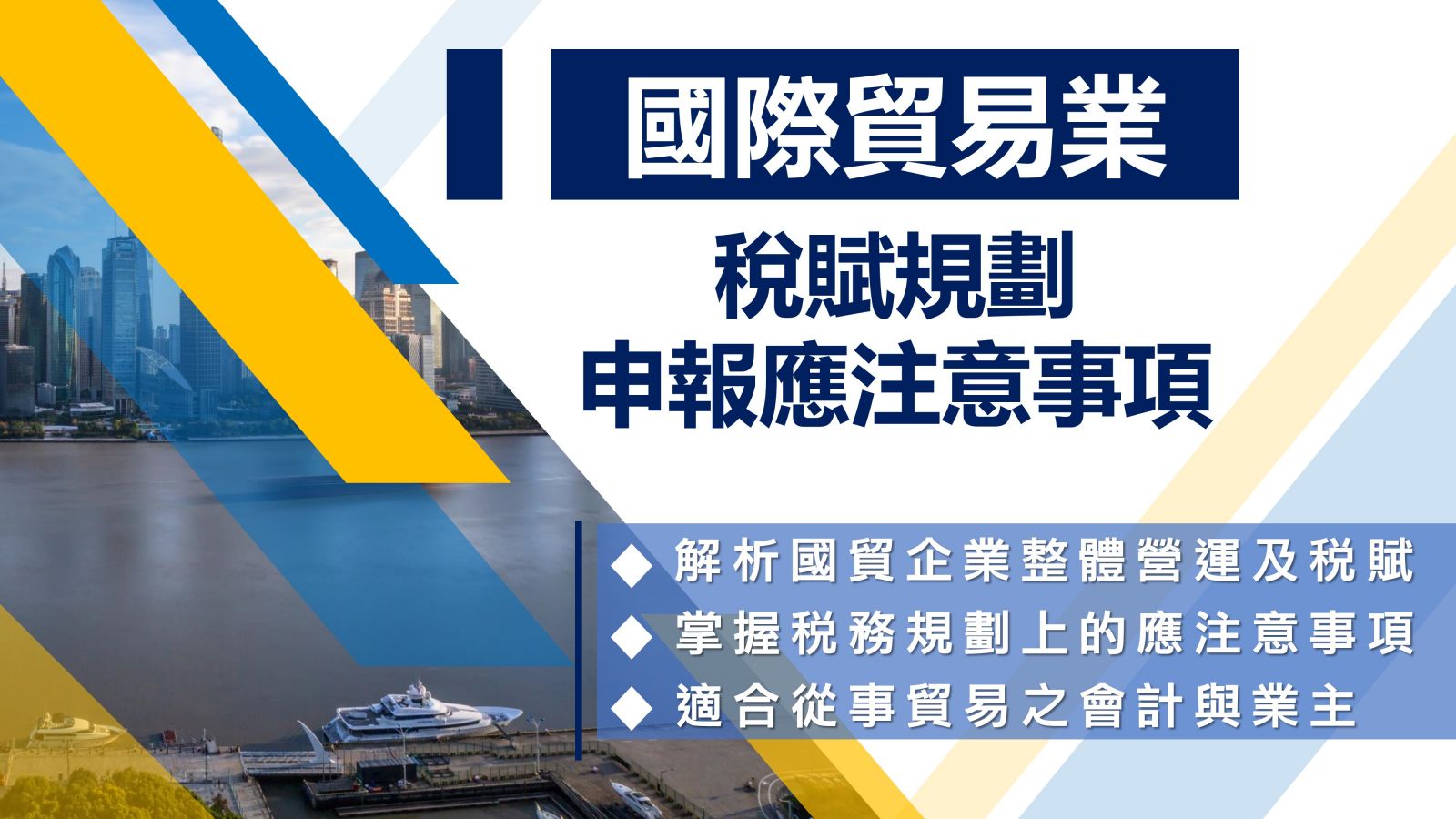 台灣是以外貿為導向的經濟實體,國際貿易在台灣的總體經濟上,也扮演著非常重要的腳色;中小企業之中,營運國際貿易的比重也相當之高,然而,國際貿易的稅務申報,也有其獨特性,例如:部分國際貿易的營運收益,並非營業稅的申報範圍,支付海外佣金時,稅務申報上,亦有其上限;再者,出國參展或是拜訪客戶也有差旅費的申報限額,大部分國際貿易業者,多數也會使用高風險的OBU架構,是故,透過本課程的分析,可以讓國際貿易業主進一步掌握國際貿易稅務規劃上的應注意事項。