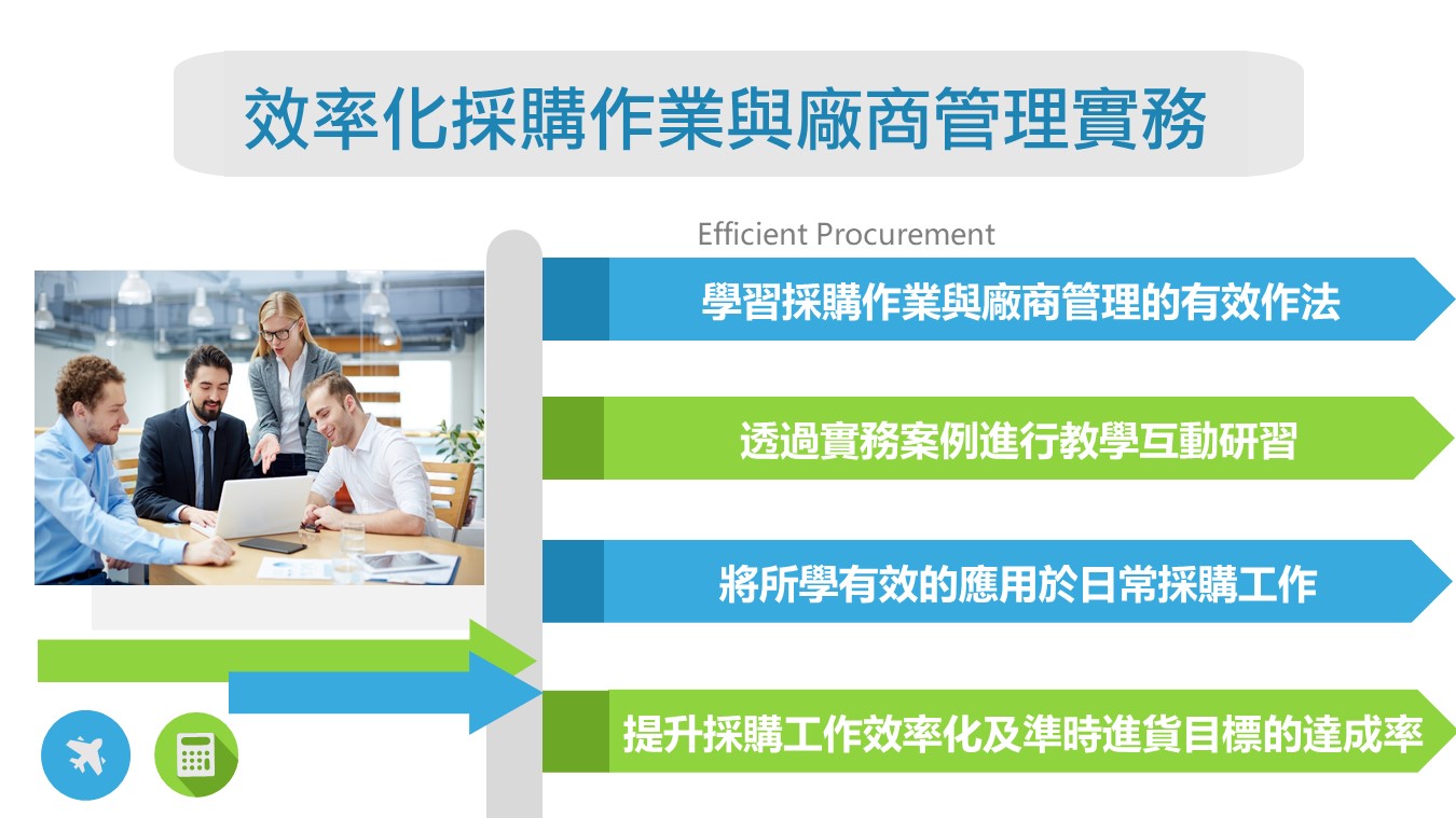 協助採購及外包主管、採購專員瞭解採購作業與廠商管理的內容及實務作法,善用於日常採購工作與協力廠商的互動管理上 ,提升採購工作效率化及準時進貨目標的達成率。