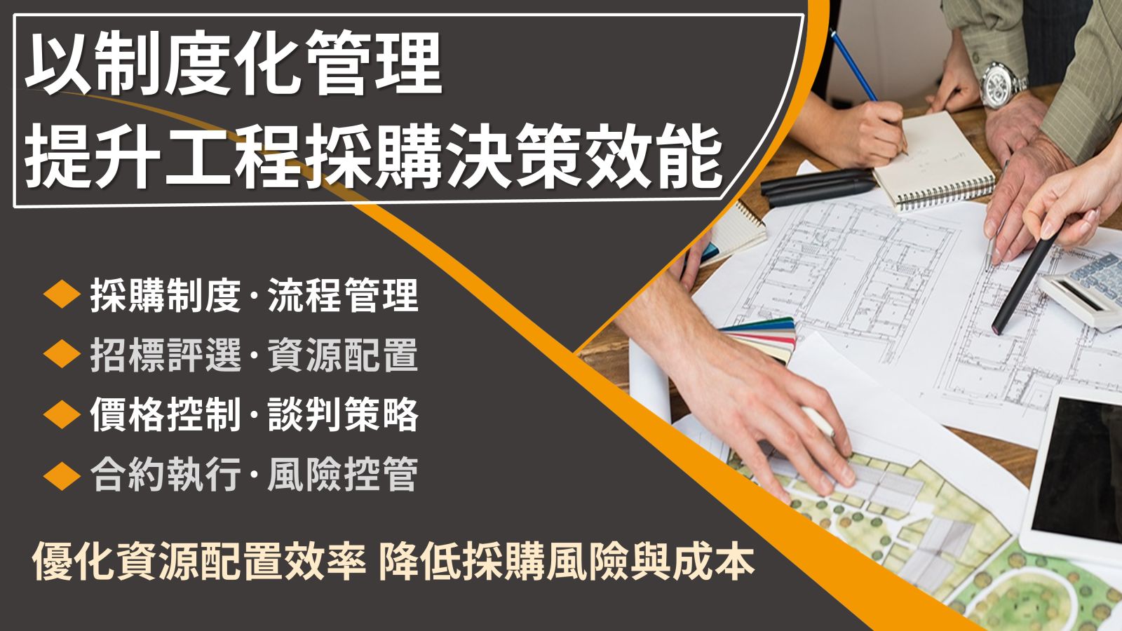 工程採購人員如何應用標案文件、工料分析、工程底價、選對工程廠商、招標與比價、談判議價、工程技術、合約管理等做法,以提升工程採購人員本身的技術與效益。