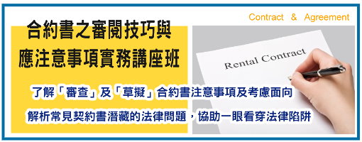 合約書為當事人間之憲法,透過合約文字的安排與特約條款,在哪些情形下可以排除法律規定、哪些情形下可補充法律之不足,並如何強化甚至擔保合約書之徹底履行?講座將從如何選擇契約切入,以六大重點傳授如何審查合約書以及如何草擬合約書,協助從業人員一眼看穿一份合約書的法律問題,一則預防糾紛發生,一則學會擬定對公司有保障的合約條款,協助訓後可輕鬆勝任審查合約之任務。