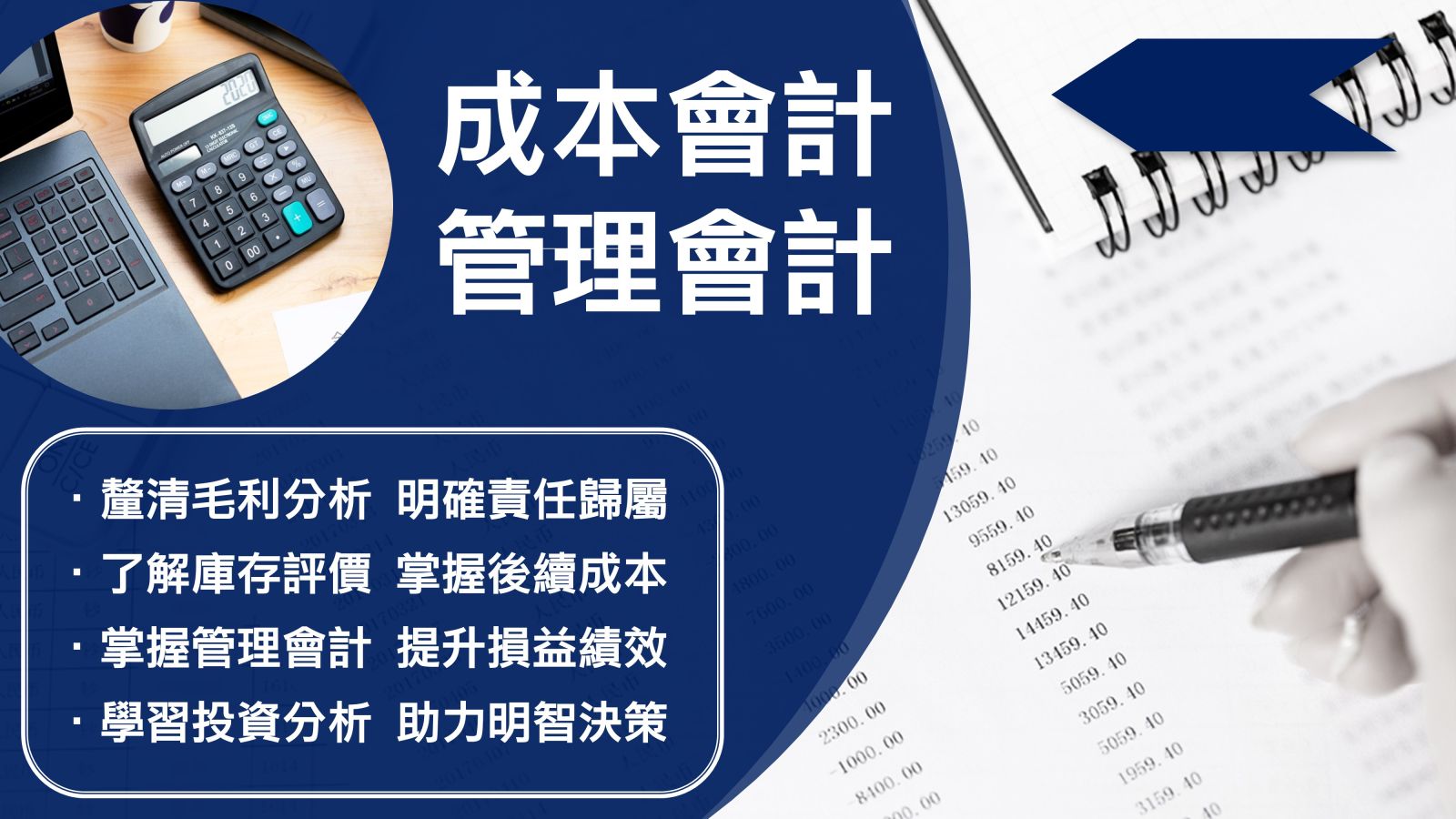 - 本課程教導成本會計中成本的資料收集、產品成本的計算,管理會計應有的正確觀念及分析管理應有的技能。