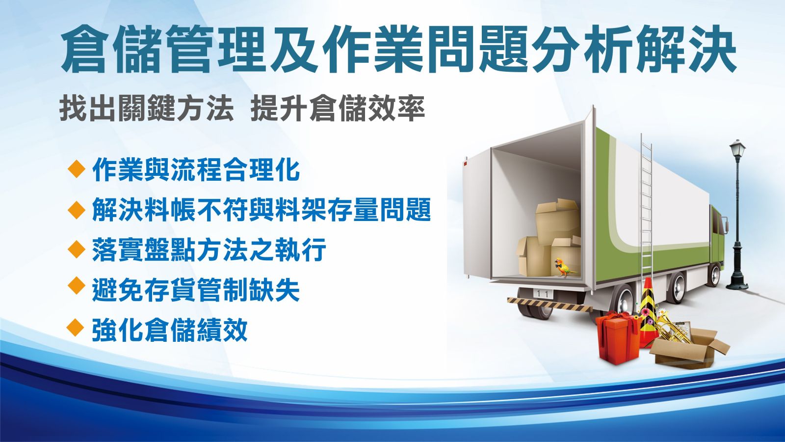 協助倉儲及物料管理主管、倉管專員及相關管理幹部瞭解倉儲實務常見問題分析,學習效率化解決倉儲實務問題的實用方法與作業技巧,例如:空間利用、倉儲設備選用,以及人員不足、料帳不符、盤點缺失、倉儲績效不佳等處理要訣,提升倉儲工作效率。