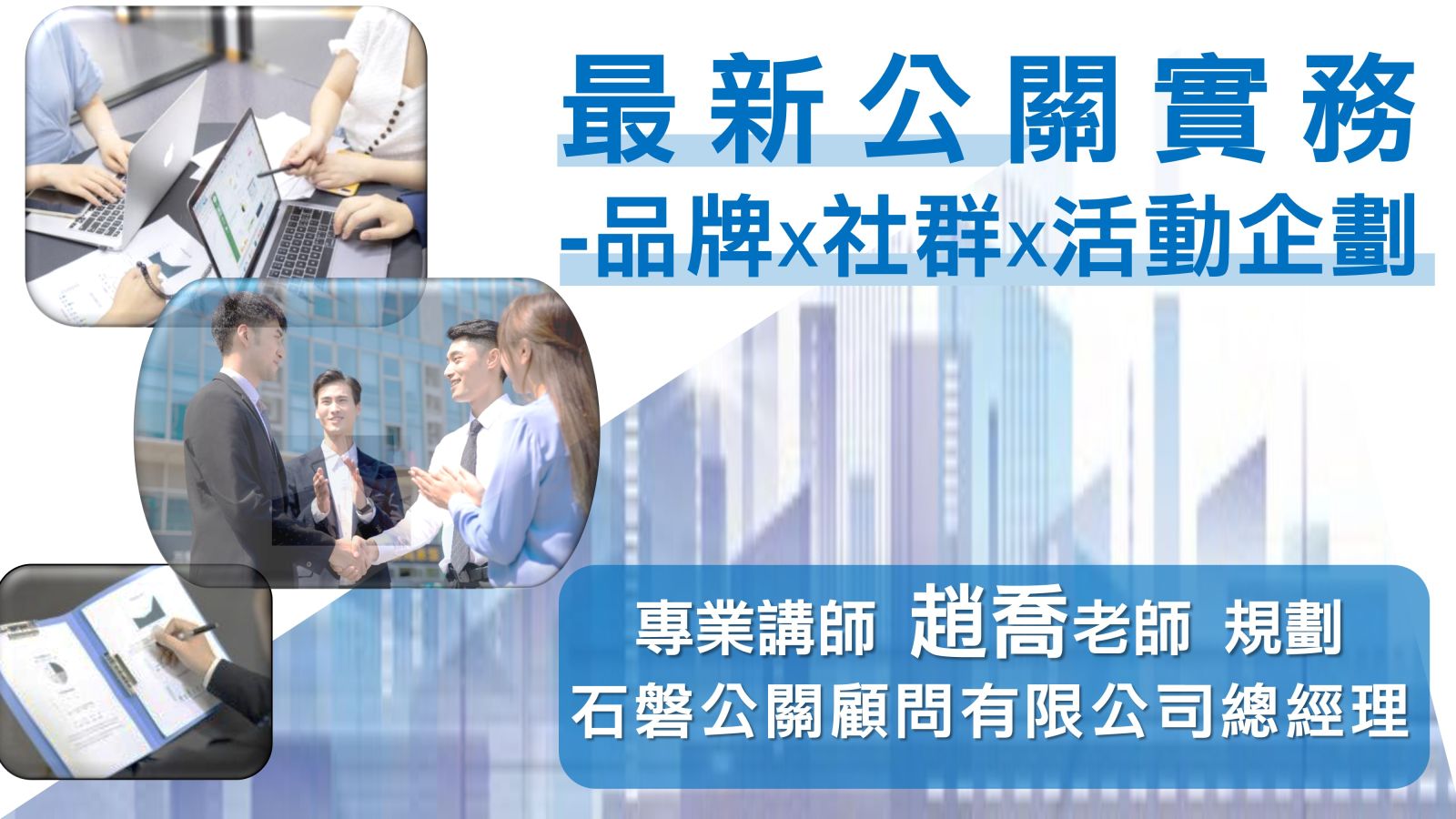 師資簡介: 經歷:精英公關顧問有限公司 執行副總、鉅源多媒體股份有限公司 社長兼總經理 執行客戶: J&J、旺宏電子、聯發科、迪士尼DISNEY、ESPN STAR Sports、孩之寶、巨崗洋行、KPMG、Dun & Bradstreet、Disney Channel、Playhouse Disney、KOSE、CHANEL、DKNY、如新、花王、雀巢、克寧、海尼根、保樂力加、新光保全、匯豐銀行、花旗銀行、台新銀行、德國百靈、食益補白蘭氏雞精、經濟部工業局、經濟部能源局、經濟部中小企業處、經濟部商業司、行政院環境保護署、行政院衛生署食品藥物管理局、行政院客家委員會、行政院新聞局、行政院研考會、行政院青年輔導委員會、行政院農業委員會林務局、行政院農業委員會漁業署、教育部、財團法人工業技術研究院、財團法人精密機械研究發展中心、財團法人台灣綠色生產力基金會、財團法人中技社、財團法人中華民國電腦技能基金會、財團法人中山科學研究院、財團法人台灣營建研究院、財團法人台灣經濟研究院、財團法人生物技術開發中心、財團法人漢光教育基金會、財團法人旺宏電子教育基金會、財團法人中國青年和平團、財團法人導航基金會、臺北市政府、新北市政府、台中市政府、高雄市政府、花蓮市政府、南投縣政府、米堤大飯店、禎祥食品等