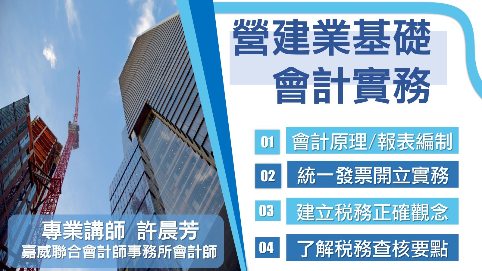 鑑於營建業的會計科目和會計處理與其他行業不同,讓剛踏入營建業的會計人員增加了摸索的時間,可能導致產生錯誤及面臨主管機關裁罰之風險。本課程特為剛踏入營建業的會計人員所設計,透過解說營建業各類稅賦及會計處理方式,同時協助參訓者應用於工作上,快速熟悉申報實務作業,提高公司營運績效,掌握企業營運的財務資訊。