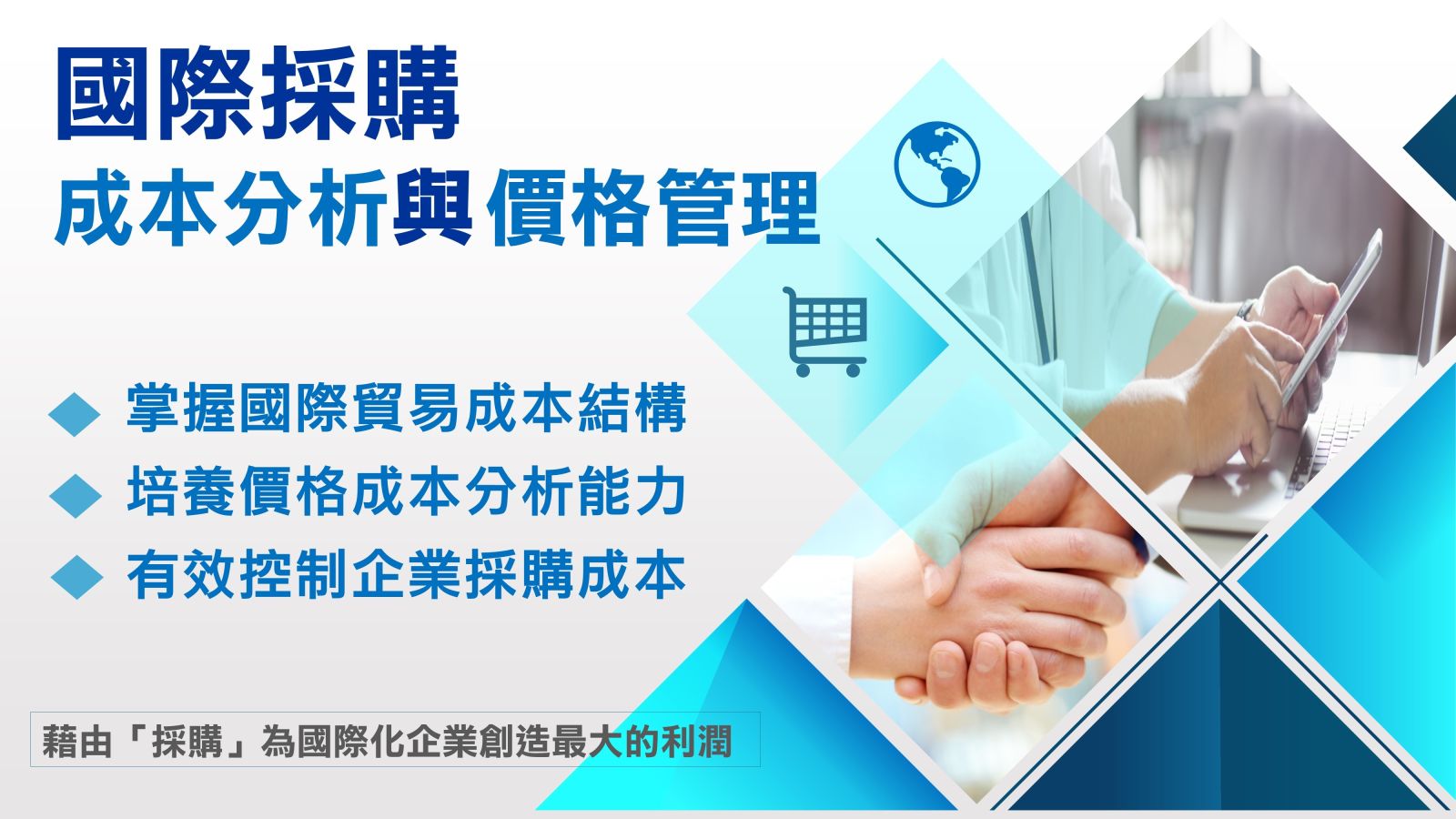 3. 精通國際採購管理:深入了解國際貿易條件與風險,學員將能夠認知進口價格要素,並在國際採購中控制成本,提升跨國採購效益。