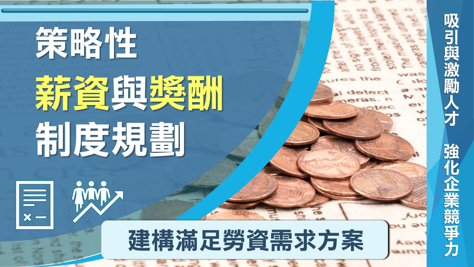 少子化時代!人力大缺工!如何留住人才是重要的關鍵!此次課程透過精心設計的薪酬架構和獎勵方案,將學習到如何吸引、留住和激勵優秀人才,提高企業的競爭力,克服人才流失帶來的挑戰。