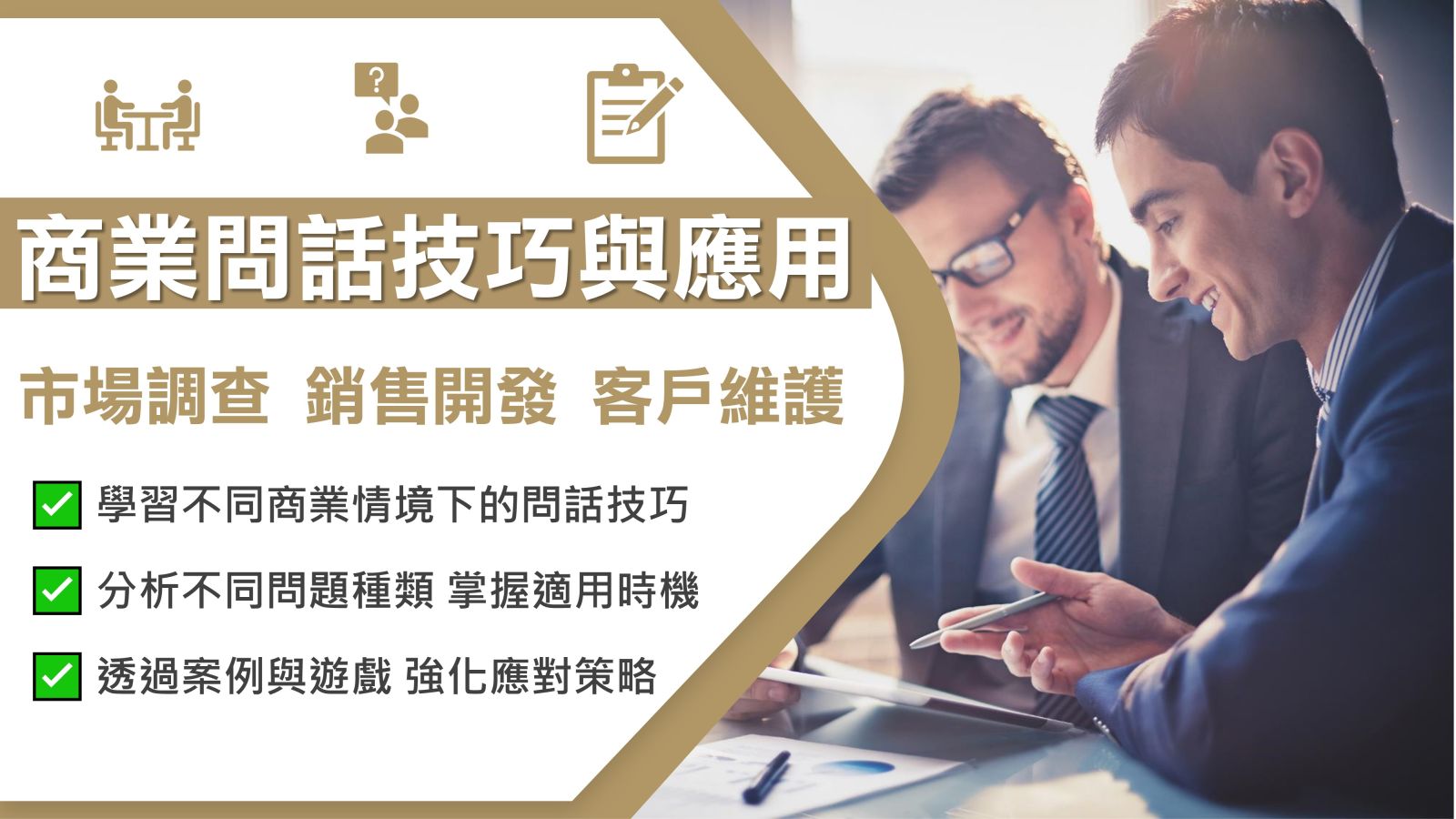 這門課程涵蓋市場調查、銷售開發和客戶維護各個階段完整學習問話技巧。旨在全面提升學員的商業問話技巧,並在實際工作中靈活應用,透過案例與模擬演練,讓學員學會應用。