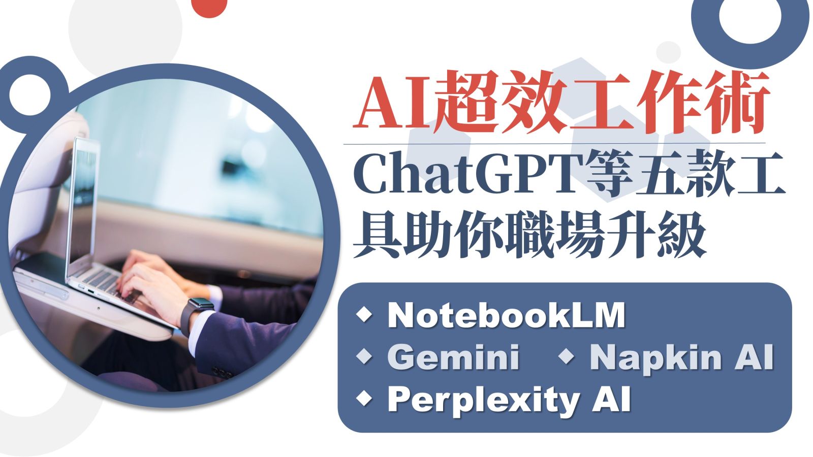 課程中,不只會提到 ChatGPT,還有 NotebookLM、Gemini、Napkin AI 與 Perplexity AI ——每一個工具都有不同強項,若你能理解它們的角色,就能組合成一個能快速產出、精準判斷的 AI 工作流。