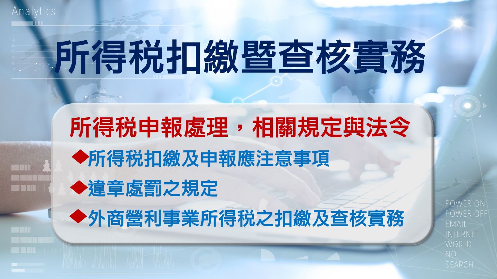 鑑於企業所得稅申報處理,對於相關規定與法令不瞭解,而導致觸法,造成對企業不利而產生損失,特開辦此課程以協助各大企業財會專業人員增加實務經驗。