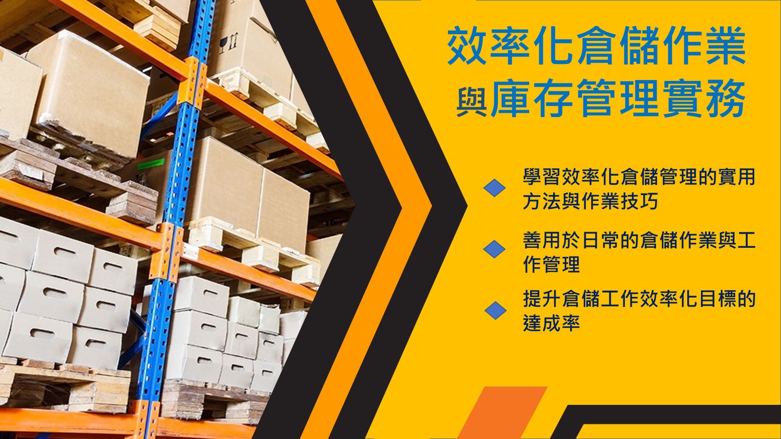 1.學習倉儲作業與管理的有效作法,包括倉儲規劃、倉儲作業制度與流程、庫房管理、進銷存作業、盤點與存貨管制等。