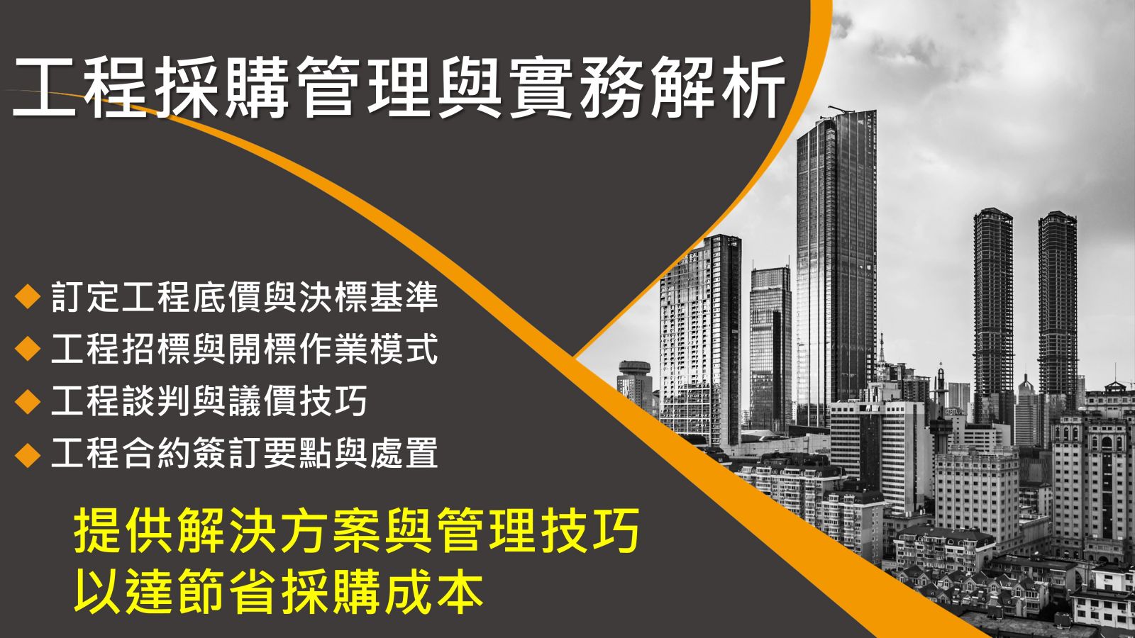 工程採購人員如何應用標案文件、工料分析、工程底價、選對工程廠商、招標與比價、談判議價、工程技術、合約管理等做法,以提升工程採購人員本身的技術與效益。