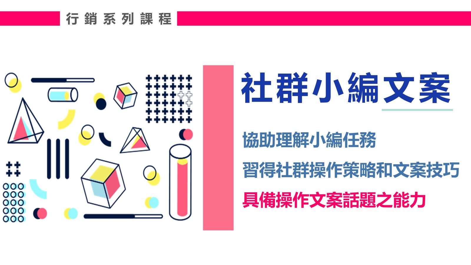 本課程講師是業界少數具備結合戲劇專業與廣告行銷經歷之故事行銷講師,配合過桃園縣政府環保局、客委會合作包含藝文展演活動等,具備劇團編導之身分,擅「故事行銷」、「微電影」與「表演行銷」等,能有效提供學員學以致用的實質助益。