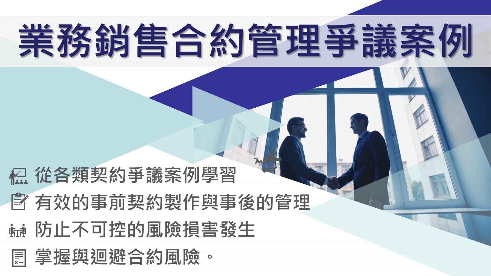本課程以銷售合約案例分享為主,分析契約簽訂條款的問題與簽訂後的合約管理作業,從合約整體管理的角度促進了企業的銷售風險預測,部分案例亦可從採購角度進行了解,即所謂知己知彼,才是現代業務銷售人員應該具備的合約管理與談判能力。