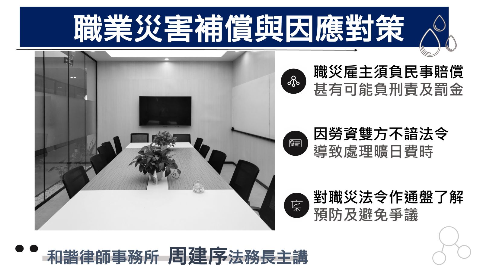 勞工一旦發生了職業災害,雇主就必須負起有關之民事賠償及補償,尤有甚者,更有可能要負三年以下的有期徒刑及併科新台幣30萬元之罰金。還有行政罰鍰部分,處新臺幣二萬元以上一百萬元以下罰鍰,最高加重二分之一至150萬元。面對如此高之民事、刑事、行政責任,事實上許多個案的發生原本在第一時間可圓滿解決,但多數是因為勞資雙方不諳相關法令,導致後來處理起來曠日費時,問題更形複雜後而進入訴訟程序,浪費雙方之寶貴時間與金錢。有鑑於此,實有必要對職災相關法令作一通盤了解以杜爭議。本課程循序漸進,由淺入深帶領各位逐一探討,希望參與的學員均能滿載而歸且能協助處理多數之個案。