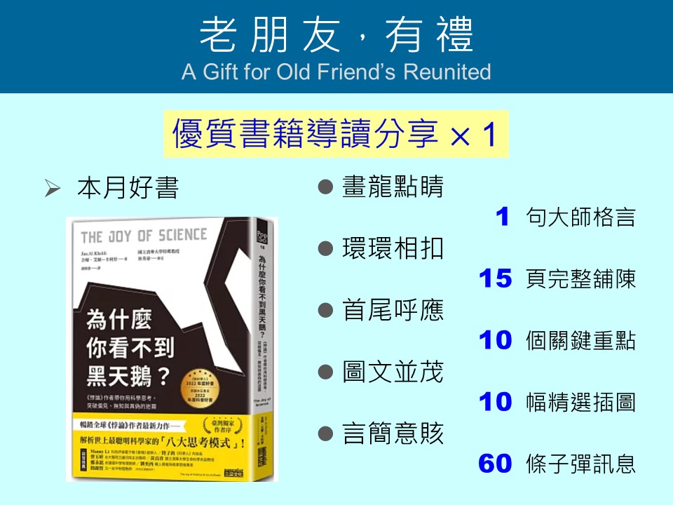 凡第二次於中華工商研究院參與曾敬一老師課程之舊學員,可於課後收到一份曾老師「優質書籍導讀分享」