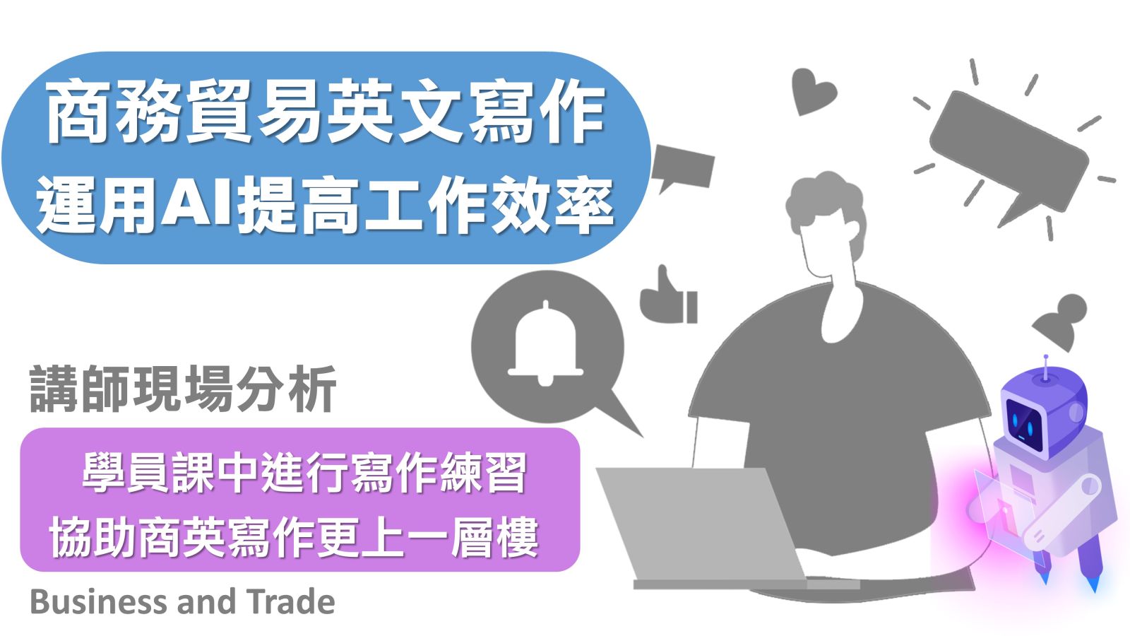 AI的時代浪潮已經降臨且在各個學習領域掀起了革新,商務英文寫作也不例外,本課程講師將使用AI縮短學員學習曲線,讓你貿易英文電子郵件寫作如開外掛。講師曾從事國際業務行銷十餘年,擁有豐富的英文商用書信與英文電子郵件寫作實戰經驗,並在多家外商科技公司擔任”英文電子郵件寫作技巧”及” 科技英文寫作”講師