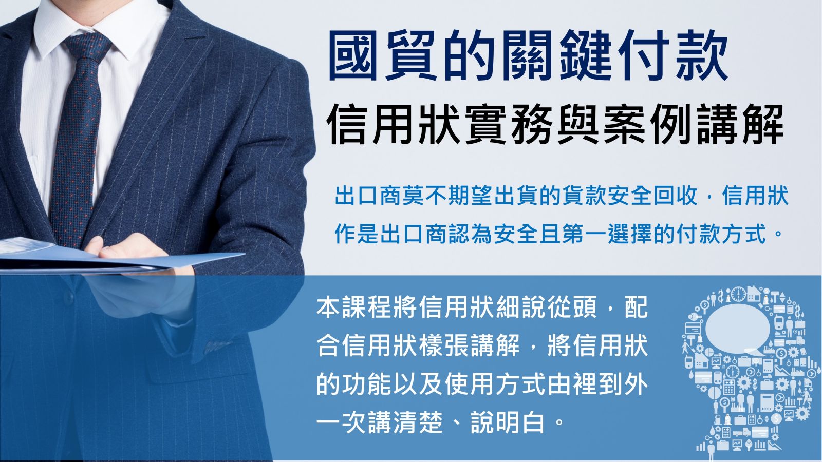 信用狀的文字是以英文呈現,內容又涉及專業,有些貿易主事者,又責令財務部門處理信用狀事宜,本課程將信用狀細說從頭,配合信用狀樣張講解,將信用狀的功能以及使用方式由裡到外一次講清楚、說明白。