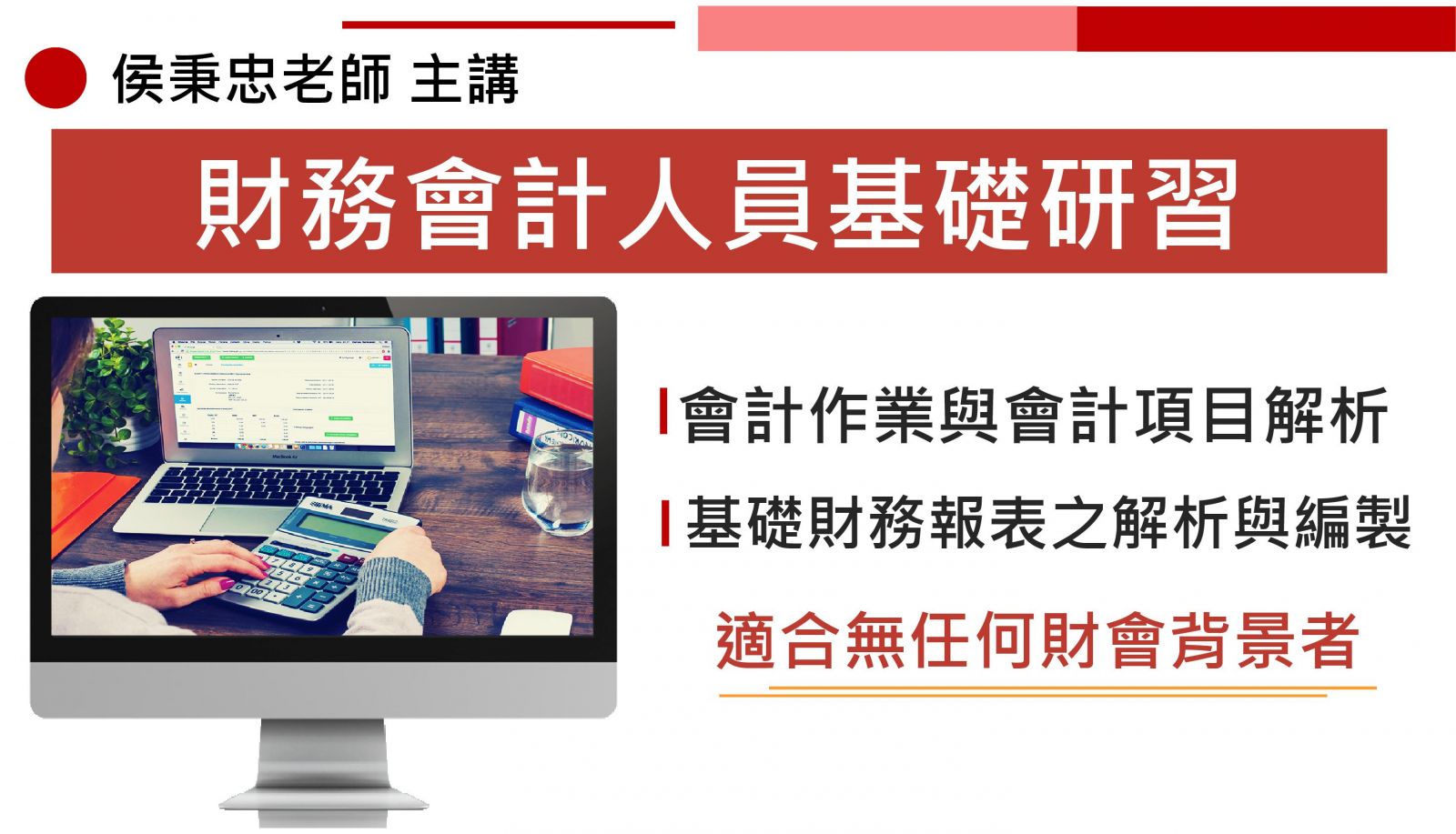 • 本課程之設計,是由淺入深,適合無任何財會背景 (無須先備知識)的學員亦可按步就班學會會計基礎作業,能運用習得的知識自主記帳、並運用簡單EXCEL樞紐分析功能即能編制出財務報表,並運用財務報表分析觀念及技巧,協助企業經營者做出正確管理決策。
