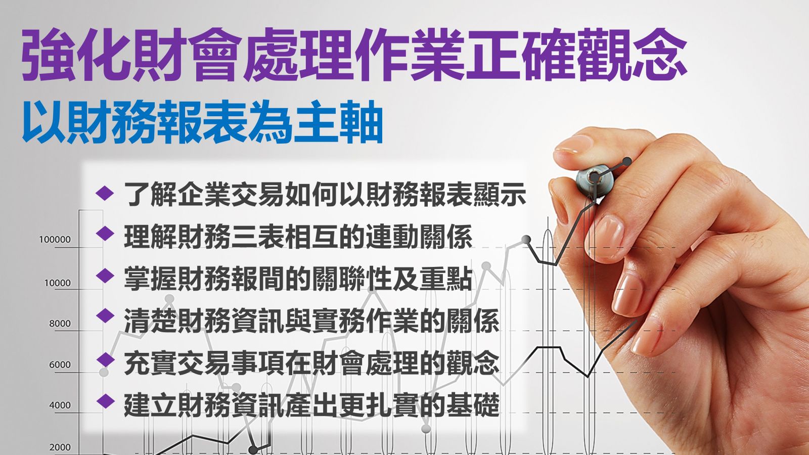 1.讓學員清楚財務資訊與實務作業間的關係。