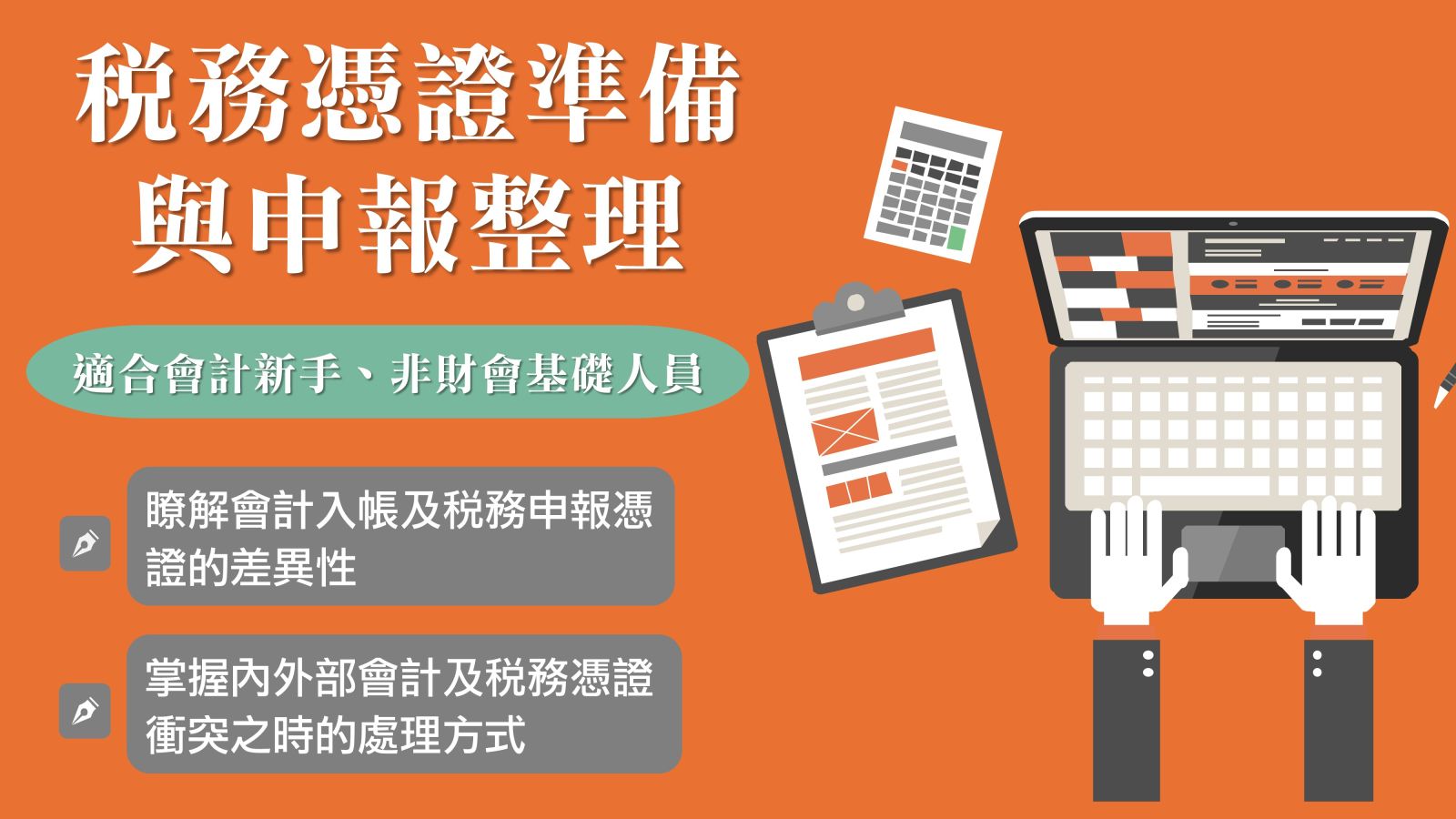 4. 協助基礎會計人員瞭解會計入帳憑證、稅務申報憑證的差異性,以利正確入帳與申報稅務