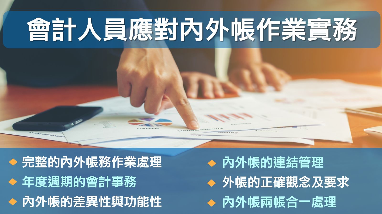 會計人員透過帳務處理產出對內營運資訊上的報告,對外按照政府主管機關的規定處理稅務申報繳納等相關事宜,無論企業新舊、規模大小、賺錢賠錢都有此等對內控管、對外稅務等簡單與複雜程度不同功能上的需求;就會計本身而言,即是財會、成會及稅務會計的事務;若從應對的重點及會計人員配置角度,即產生有內、外帳不同重點功能的需求處理及整合運用。本課程即針對公司內帳和外帳帳務處理實務做說明講授。