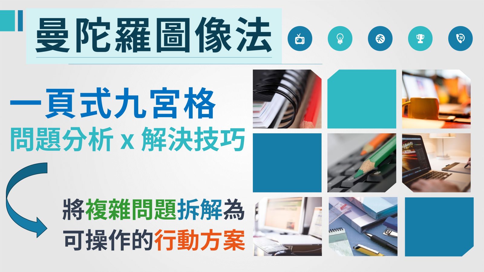 以 曼陀羅圖像法(Mandala Chart) 為核心,結合 九宮格思維工具,協助學員將複雜問題拆解為可操作的行動方案,達成 一頁式可視化思考、分享與解決 的實戰能力。